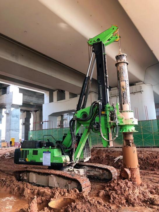 在項目現(xiàn)場,KR300ES低凈空鉆機(jī)正承擔(dān)直徑0.8米支護(hù)樁的施工重任。面對沙土層地質(zhì)條件及水孔作業(yè)要求,設(shè)備配備0.8米直徑截齒雙底撈沙斗,實現(xiàn)了一次性高效成孔。配合現(xiàn)場下2米深鋼護(hù)筒的工藝,確保了成樁質(zhì)量和施工安全。其出色的性能參數(shù)——施工高度9米、最大鉆孔深度32米、最大鉆孔直徑2.8米、最大輸出扭矩300kN.m,在緊湊的機(jī)身(整機(jī)重量76噸)內(nèi)提供了強(qiáng)大的施工能力。尤為值得一提的是,在保證安全高效施工(18米深樁僅需30分鐘)的同時,設(shè)備運(yùn)行油耗僅為18L/h,體現(xiàn)了優(yōu)異的節(jié)能環(huán)保特性。