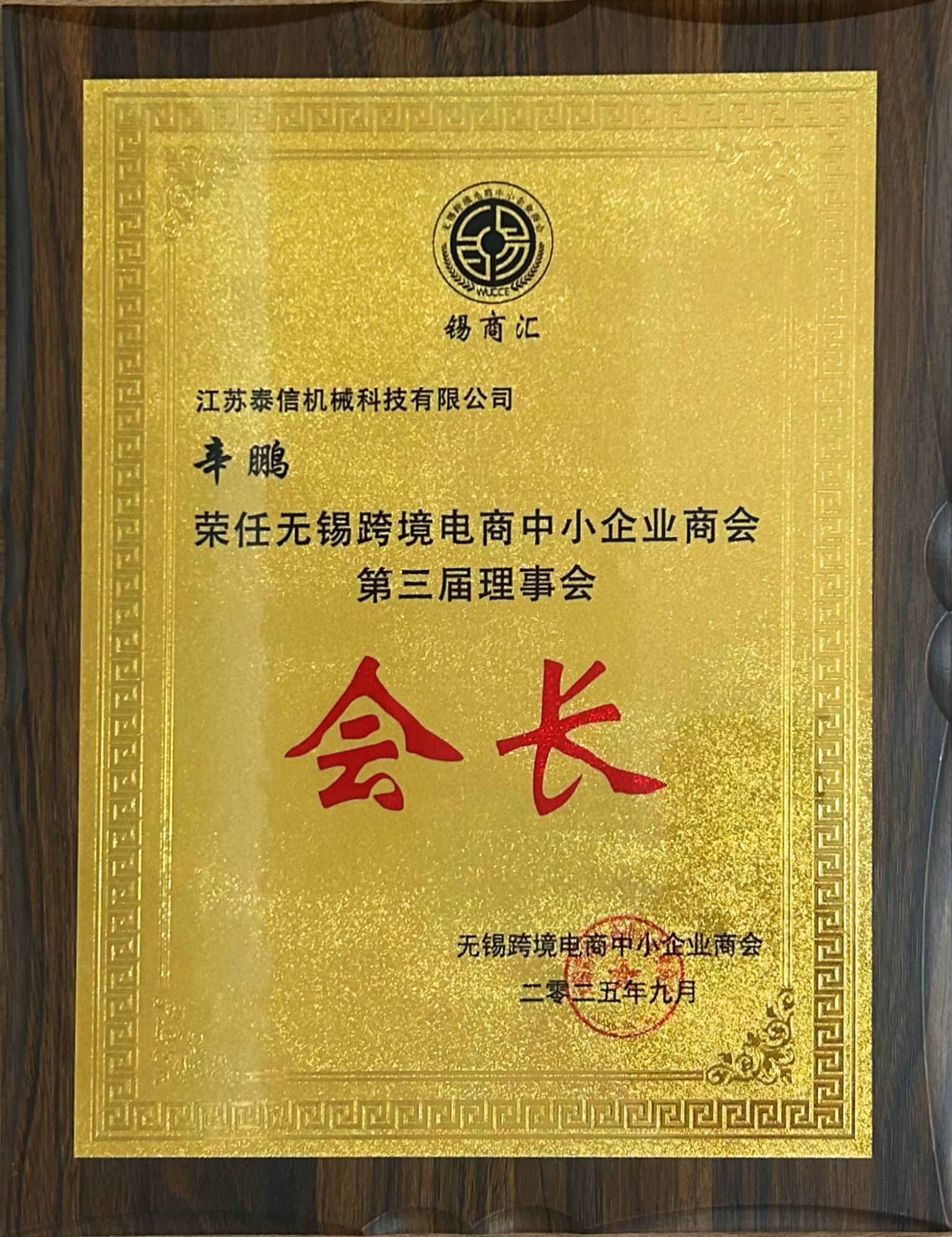 【概要描述】2025年9月12日,無錫跨境電商中小企業(yè)商會換屆大會暨成立十周年慶典在無錫君來洲際酒店圓滿落幕。江蘇泰信機械股份有限公司(以下簡稱“泰信機械”)董事長辛鵬,憑借在跨境制造領(lǐng)域的深厚積淀及與商會會員多年協(xié)同拓市的實踐口碑,經(jīng)無記名投票,正式當選商會新一屆會長。此次當選不僅標志著泰信機械將以行業(yè)領(lǐng)軍者身份推動產(chǎn)業(yè)融合,更開啟了泰信機械與商會、會員單位深度綁定、共同成長的新征程。